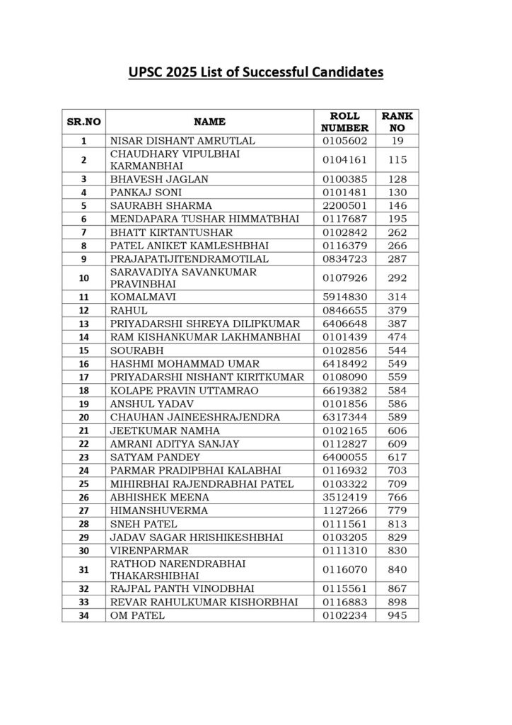 અમદાવાદ, 06 માર્ચ 2026: 34 candidates from Gujarat achieved success in UPSC, યુપીએસસી (યુનિયન પબ્લિક સર્વિસ કમિશન)ની પરીક્ષામાં ગુજરાતના 34 ઉમેદવારોએ ઝળહળતી સિદ્ધિ મેળવી છે. યુપીએસસીનું 2025નું ફાઈનલનું આજે રિઝલ્ટ જાહેર થતાં દેશમાં કૂલ 958 ઉમેદવારો વિવિધ સેવાઓ માટે ક્વોલિફાય થયા છે. જેમાં ગુજરાતના (SPIPA)ના 34 ઉમેદવારો બાજી મારવામાં સફળ રહ્યા છે. ગુજરાતના નિસાર દિશાંતે ઓલ ઈન્ડિયા 19મો રેન્ક પ્રાપ્ત કર્યો છે.