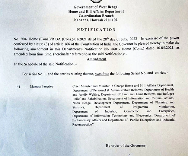 મુખ્ય સચિવ હરિકૃષ્ણ દ્વિવેદીએ એક સૂચનામાં જણાવ્યું હતું કે ચેટરજીને ઉદ્યોગ, વાણિજ્ય અને સાહસો, ઇન્ફોર્મેશન ટેક્નોલોજી અને ઇલેક્ટ્રોનિક્સ, સંસદીય બાબતો અને જાહેર સાહસો અને ઔદ્યોગિક પુનર્નિર્માણના પ્રભારી મંત્રી પદેથી દૂર કરવામાં આવ્યા હતા.આ વિભાગો હવે મુખ્યમંત્રી હેઠળ રહેશે.