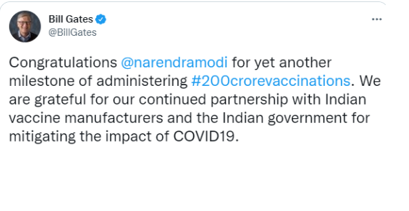 દિલ્હીઃ- દેશભરમાં મોટા પાયે વેક્સિનેશન કરવામાં આવી રહ્યું છે આ અંતર્ગત ભારતે 200 કરોડનો આકંડો સ્પર્શ કરી લીધો છે જેની વિશ્વભરમાં ખૂબ પ્રસંશાઓ થઈ રહી છે.ભારતની આ ઉપલબ્ધિ વિશે માઈક્રોસોફ્ટના સહ-સંસ્થાપક બિલ ગેટ્સે પણ ભારતની પ્રસંશા કરી છે અને દેશના પ્રધાનમંત્રી મોદીને અભિનંદન પાઠ્વ્યા છે.
