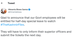 આ ફિલ્મને લઈને હવે આસામ રાજ્યના કર્મચારીઓને આ ફિલ્મ જોવા માટે અડધા દિવસની રજા આપવાની જાહેરાત રાજ્યના મુખ્યમંત્રી હેમંત બિસ્વા સરમાએ કરી છે, જે પ્રમાણે તમામ રાજ્ય સરકારના કર્મચારીઓ માટે ફિલ્મ ધ કાશ્મીર ફાઇલ્સ જોવા માટે અડધા દિવસની આપવામાં આવશે.
