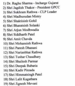 આ સમિતિમાં પ્રદેશ પ્રમુખ જગદીશ ઠાકોર, પ્રબારી રઘુ શર્મા, વિધાનસભા વિરોધ પક્ષના નેતા સુખરામ રાઠવા, રાજ્યસભાના સાંસદ અને CWC સભ્ય શક્તિસંહ ગોહિલ, બનાસકાંઠાના ધારાસભ્ય જીગ્નેશ મેવાણી સહિતના અન્ય રાજકીય આગેવાનોને સ્થાન આપવામાં આવ્યું છે. મધુસુદન મિસ્ત્રી, ભરતસિંહ ગોહિલ, અર્જુન મોઢવાડિયા, સિદ્ધાર્થ પટેલ, અમિત ચાવડા, શૈલેષ પરમાર, પરેશ ધાનાણી, નારયણ રાઠવા, તુષાર ચૌધરી સહિતના આગેવાનો પણ સ્થાન આપવામાં આવ્યું છે. આગામી દિવસોમાં કોંગ્રેસના અન્ય નેતાઓને પણ મહત્વની જવાબદારી સોંપવામાં આવે તેવી શકયતા છે.