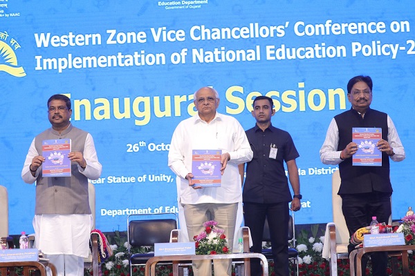 અમદાવાદઃ મુખ્યમંત્રી ભૂપેન્દ્ર પટેલે નર્મદા જિલ્લાના એકતાનગર સ્થિત ટેન્ટ સિટી-2 ખાતે રાષ્ટ્રીય શિક્ષણ નીતિ (NEP) 2020ના અમલીકરણ અંગે વાઈસ ચાન્સેલર્સ અને NEP કોઓર્ડિનેટર્સની એક દિવસીય કોન્ફરન્સનો શુભારંભ કરાવ્યો હતો. કેન્દ્રીય શિક્ષણ મંત્રી ધર્મેન્દ્ર પ્રધાન, આરોગ્ય અને તબીબી, ઉચ્ચ અને ટેક્નિકલ શિક્ષણ મંત્રી ઋષિકેશભાઈ પટેલ અને શિક્ષણ રાજ્ય મંત્રી પ્રફુલ્લભાઈ પાનશેરિયાની પ્રેરક ઉપસ્થિતિમાં આયોજિત કોન્ફરન્સમાં NEP અંતર્ગત શિક્ષણક્ષેત્રને સમૃદ્ધ અને ક્ષમતાકેન્દ્રી બનાવવા સારસ્વતોએ અહીં સામૂહિક વિચાર મંથન કર્યું હતું.