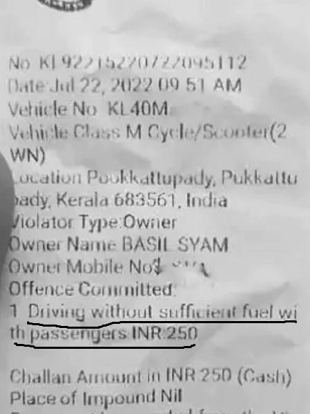 સુત્રોના જણાવ્યા અનુસાર કેરળમાં રહેતો તુલસી શ્યામ નામનો યુવાન મોટરસાઈકલ લઈને ઓફિસ જઈ રહ્યો હતો. વન-વે ઉપર યુવાન રોંગસાઈડમાં વાહન હંકારતો હોવાથી ટ્રાફિક પોલીસે તેને અટકાવ્યો હતો અને રૂ. 250ના દંડ ફટકાર્યો હતો. દંડ ભરીને યુવાનો ઓફિસ જતો રહ્યો હતો. જો કે, ટ્રાફિક પોલીસે આપેલી દંડની રસીદ જોતા તેમાં વાહનમાં ઈંધણ ઓછુ હોવાથી દંડ કરાયાનો ઉલ્લેખ કરવામાં આવ્યો હતો. જેથી વાહન ચાલક યુવાન પણ ચોંકી ઉઠ્યો હતો.