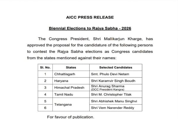 નવી દિલ્હી, 5 માર્ચ 2026: કોંગ્રેસ પાર્ટીએ આગામી રાજ્યસભાની દ્વિવાર્ષિક ચૂંટણીઓ માટે પોતાના ઉમેદવારોના નામોની સત્તાવાર જાહેરાત કરી દીધી છે. પાર્ટીએ વિવિધ રાજ્યોમાંથી કુલ છ ઉમેદવારોની યાદી જાહેર કરી છે, જેમાં વરિષ્ઠ નેતાઓની સાથે અનુભવી ચહેરાઓને ફરીથી પ્રાધાન્ય આપવામાં આવ્યું છે. તેલંગાણા રાજ્યમાંથી કોંગ્રેસે વરિષ્ઠ નેતા અને જાણીતા ધારાશાસ્ત્રી અભિષેક મનુ સિંઘવીને ફરીથી ઉમેદવાર બનાવ્યા છે. તેમની સાથે જ રાજ્યના મુખ્યમંત્રી રેવંત રેડ્ડીના નજીકના ગણાતા સલાહકાર વેમ નરેન્દ્ર રેડ્ડીને પણ ટિકિટ આપવામાં આવી છે. રાજ્યમાં કોંગ્રેસ પાસે પુરતું સંખ્યાબળ હોવાથી આ બંને ઉમેદવારોની જીત નિશ્ચિત માનવામાં આવે છે.