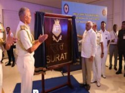 સુરતઃ મુખ્યમંત્રી ભૂપેન્દ્ર પટેલ તથા નૌકાદળના વડા એડમિરલ આર.હરિકુમારની ઉપસ્થિતિમાં ‘સુરત’ યુદ્ધજહાજના ક્રેસ્ટનું અનાવરણ સુરત ખાતે કરાયું હતું. ભારતીય નૌકાદળ દ્વારા તેના અત્યાધુનિક ચોથા મિસાઈલ ડેસ્ટ્રોયર યુદ્ધજહાજના ક્રેસ્ટ(ચિહ્ન)ને ‘સુરત’ નામ આપી સુરતના પ્રાચીન શિપબિલ્ડિંગના વારસાનું બહુમાન કરવામાં આવ્યું છે.