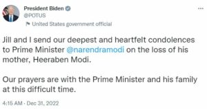 દિલ્હી:અમેરિકી રાષ્ટ્રપતિ જો બાઈડેને પીએમ મોદીના માતા હીરાબેન મોદીના નિધન પર શોક વ્યક્ત કર્યો છે.બાઈડેને ટ્વિટ કર્યું- જીલ અને હું વડા પ્રધાન નરેન્દ્ર મોદી પ્રત્યે તેમની માતા હીરાબેન મોદીના નિધન પર ઊંડી અને હૃદયપૂર્વક સંવેદના વ્યક્ત કરીએ છીએ.