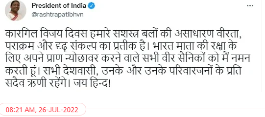 તેમએ ટ્વિટ કરીને લખ્યું છે કે “કારગિલ વિજય દિવસ એ આપણા સશસ્ત્ર દળોની અસાધારણ વિરતા,પરાક્રમ અને સંકલ્પનું પ્રતીક છે. ભારત માતાની રક્ષા માટે પોતાના પ્રાણ ન્યોછાવર કરનારા હું એ તમામ બહાદુર સૈનિકોને નમન કરું છું તમામ દેશવાસીઓ તેમના અને તેમના પરિવારના સભ્યોના હંમેશા ઋણી રહેશે. જય હિન્દ!”